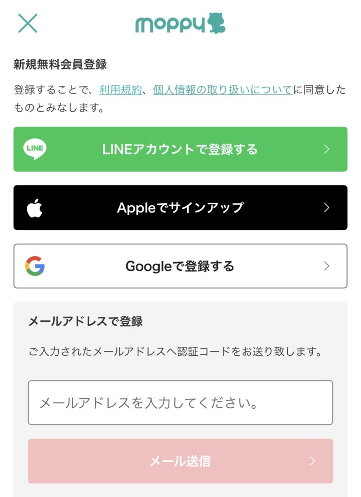 メールアドレス、LINEアカウント、Google、Yahoo! JAPAN IDのうちいずれかを用いて登録を行うことができます。