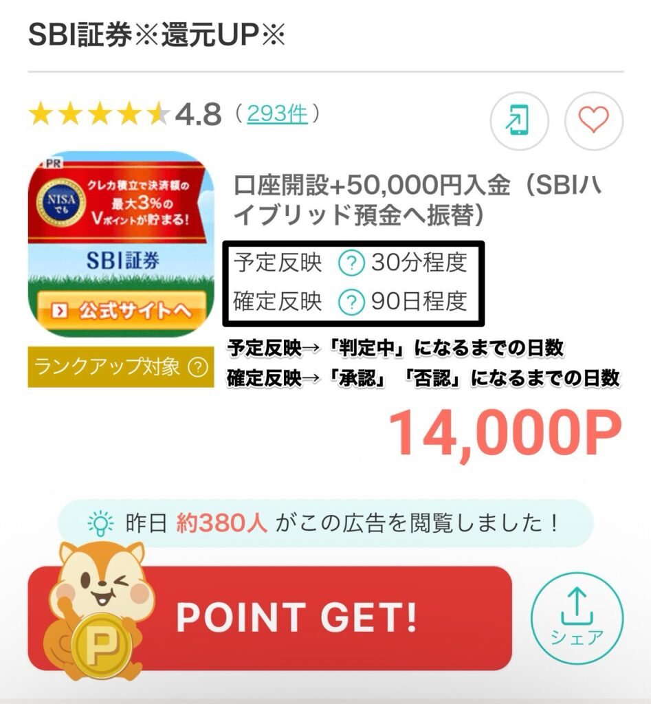ありがちな失敗パターンとして考えられるのは、入会月の翌々月末日までに「判定中」→「承認」にいかないポイントがあり、5,000Pに到達できないパターンです。モッピーでは、広告(案件)を利用してポイントを貯める方法がメジャーです。広告(案件)を利用する際には、「判定中」→「承認」になるまでの目安日数が記載されているので入会月の翌々月末日までに達成できそうな案件を選んでやっていきましょう。